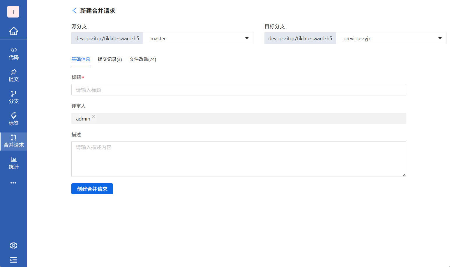 2.将源分支合并到目标分支。选择源分支、目标分支 ,输入标题,选择评审人然后点击创建合并请求按钮创建合并请求,选择的源分支和目标分支提交有差异才会显示基础信息、提交记录、文件改动。