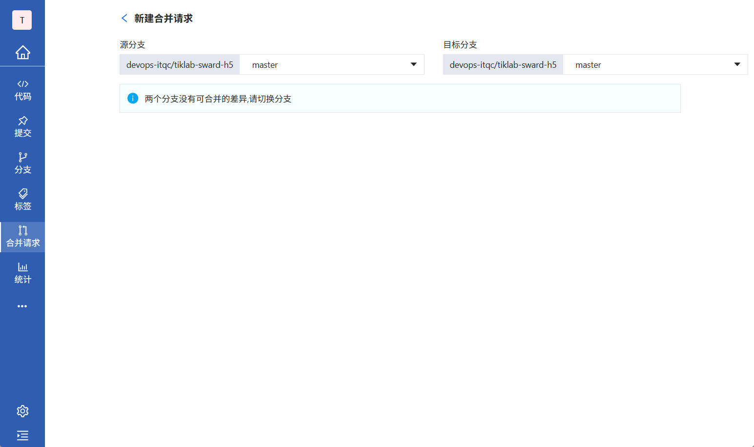 3.选择的源分支和目标分支存在已经开启的合并请求,只需要点击查看合并请求直接进入已经创建的合并请求详情界面,如果选择的源分支和目标分支没有差异,是创建不了合并请求。
