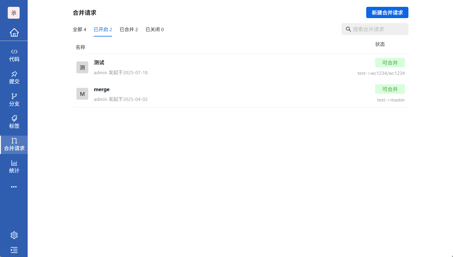 进入仓库详情,点击合并请求查询合并请求列表,查询条件:全部、已开启、已合并、已关闭的以及模糊查询合并请求标签。