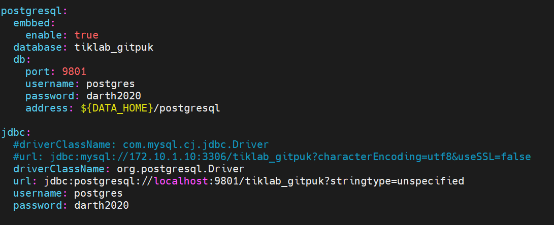 注意:使用外部数据库的时候,需要将内嵌数据库postgresql.embbed.enable后面的数据修改为false