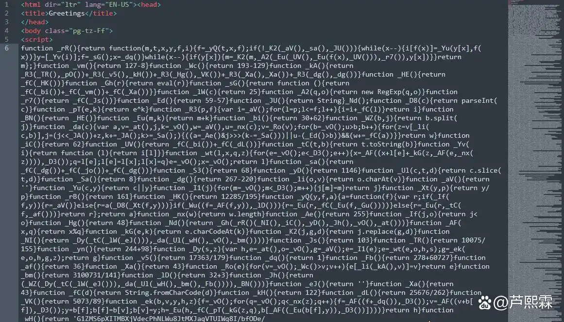 函数名混淆:所有函数名(如_rR、_kA、_HE)和变量名均经过混淆,通过短命名和_前缀干扰静态分析。