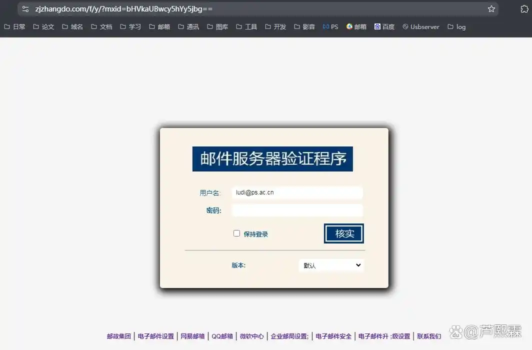 标题与图标:标题为“邮件服务器验证程序”,图标favicon.jpg可能伪装成企业邮箱或云服务(如微软、QQ邮箱),增强可信度。