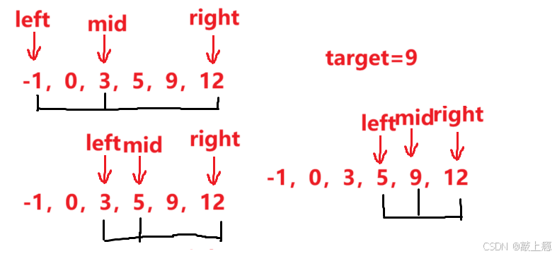 接下来锁定target的位置:如果target小于mid下标指向的元素,那么因为数组是升序,所以target一定在区间[left,mid]中,即right更新为mid,然后更新mid( mid=left+(right-left)/2 )。 如果target大于mid指向元素,那么target一定在区间[mid,right]中,即把left更新为mid,然后更新mid。重复操作直到left>right。