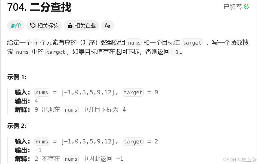 该题目要求是给一个元素target然后在升序数组nums中找到该元素的下标,若不存在则返回-1。题目要求简单易懂就不再多讲,这里要注意两个点:(1)、数组是升序的。(2)、需要返回的是元素下标。
