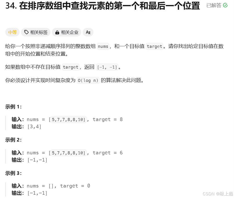 同样的此题可以使用暴力枚举来解决,不过时间复杂度为O(N),根据上题的经验这里我们还是考虑使用二分法。不过也很容易发现把上面的算法原模原样搬过来是解决不了该道题的,我们只能找到target元素的是无法锁定它第一次出现的位置和最后一次出现的位置。我们可以用以下解法: