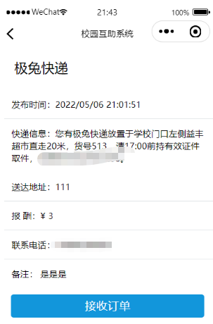 随着社会信息化程度的提高,互联网络日益改变着人们的生活、工作与思维方式,计算机技术在各行各业的应用领域越来越广,影响力持续增强。校园信息的数字化管理是各大高校网络建设重点关注的领域。基于小程序的校园信息互助共享平台,实现了校园公告、求助、快递、二手物品交易等功能模块,丰富了校园信息管理,实现学生间信息资源共享的一站式服务,为学生校园生活带来便利,满足了学生日常需求,助力实现校园资源管理信息化。