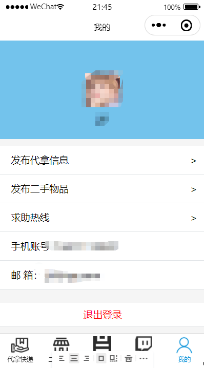(2)用户:学生用户在登录后,系统会自动显示出主要模块,用户可自行查看快递信息、二手市场、管理订单信息、查看公告信息、并管理个人中心。