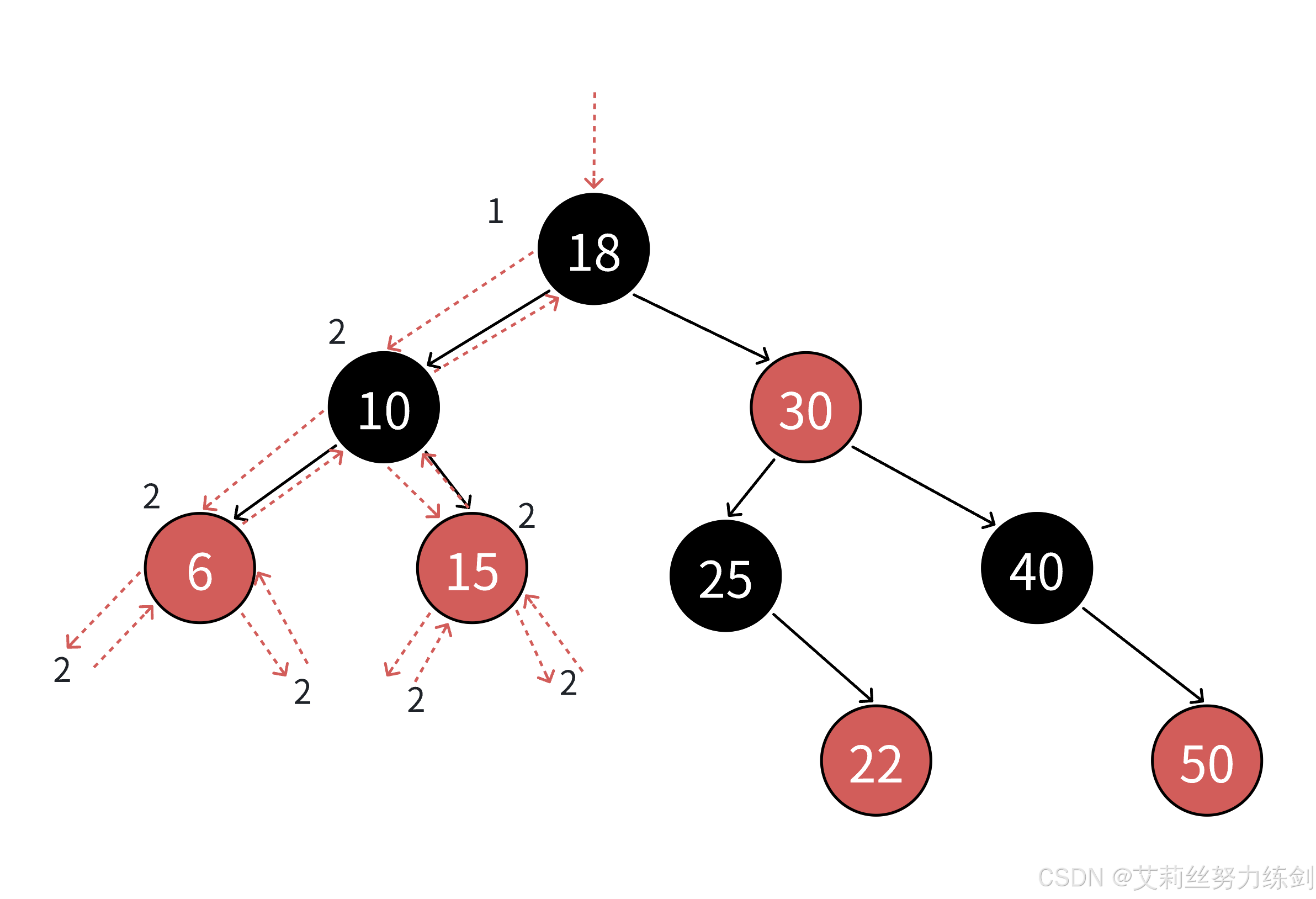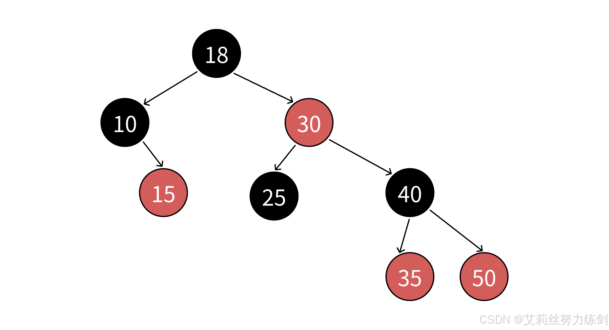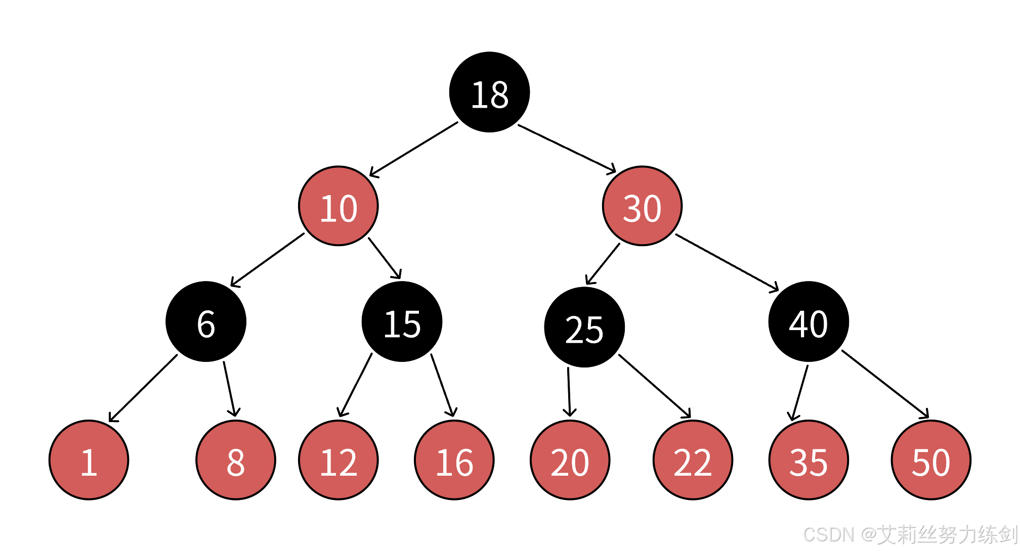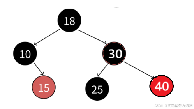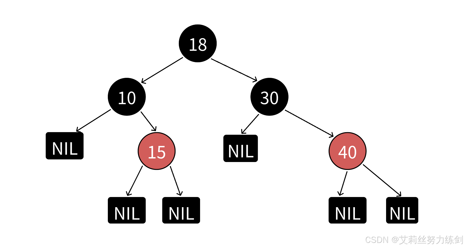 有人会问,这个NIL是啥?这个叫叶子节点,但是这个和我们二叉树里面的叶子结点不是同一个东西!这个叶子结点指的是空节点,比如上面的红色节点15,不是真正的叶子结点,它下面还有两个空节点,所以上面的黑色节点10、30还有个左孩子的NIL。