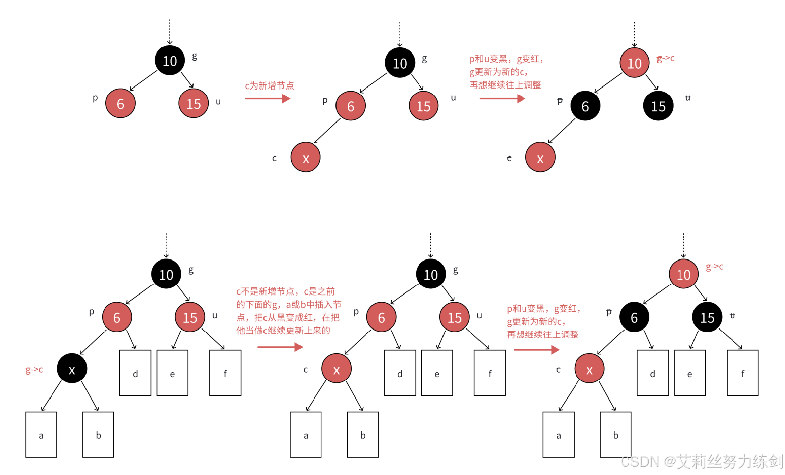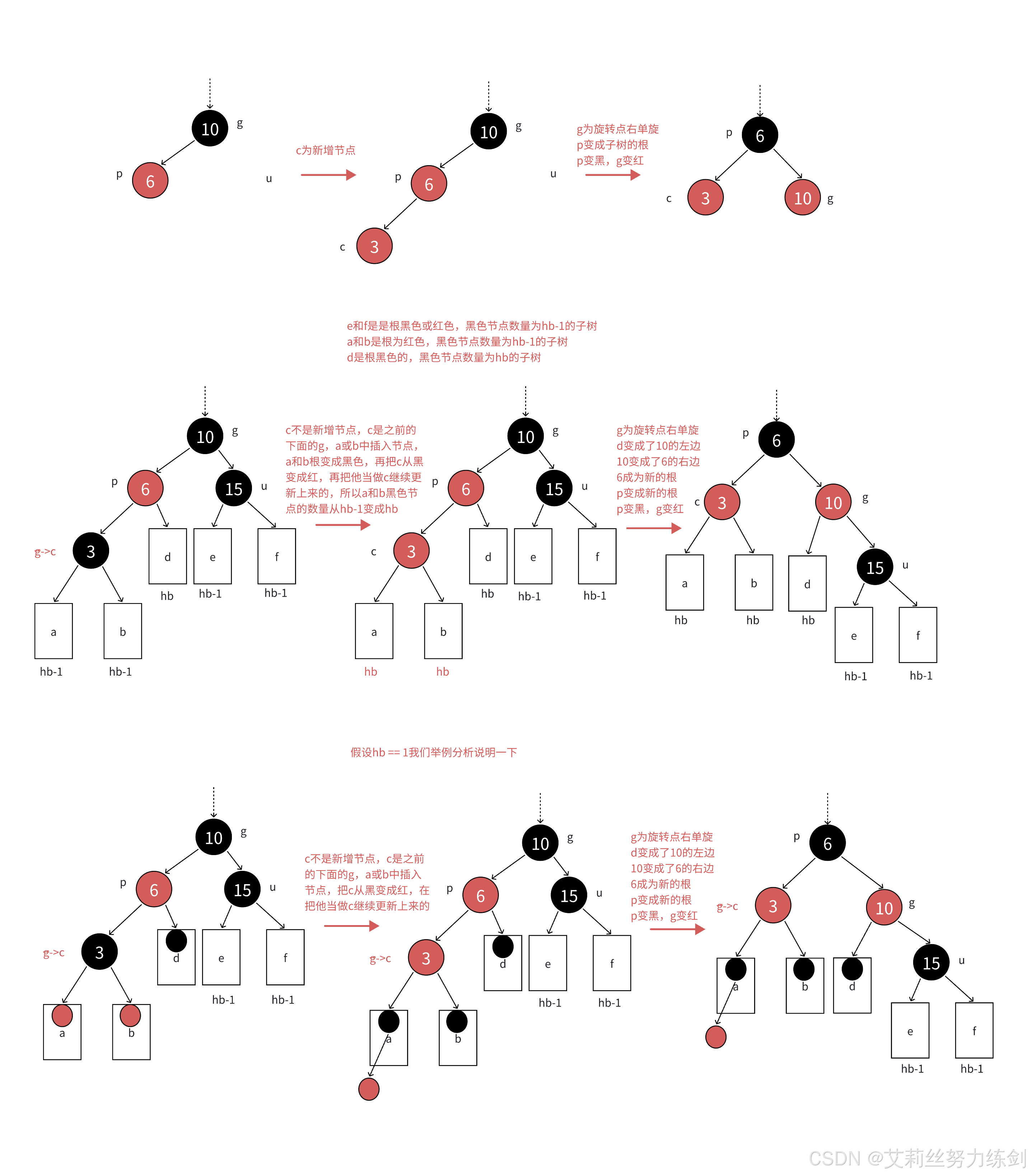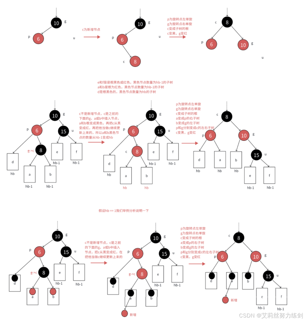 logN,也就意味着红黑树增删查改最坏情况也就是走最长路径2*logN,那么时间复杂度还是 O(logN),像插入的情况艾莉丝在概念那里就已经给出了一个例子,这里不再赘述。