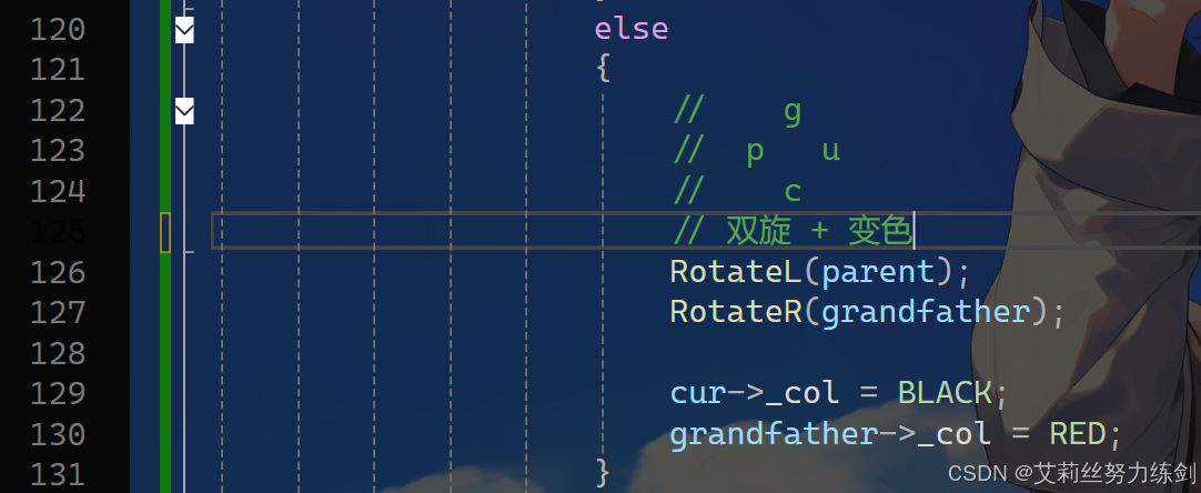 如果p是g的左,c是p的右,那么先以p为旋转点进行左单旋,再以g为旋转点进行右单旋,再把c变 黑,g变红即可。c变成课这颗树新的根,这样子树黑色结点的数量不变,没有连续的红色结点了,且不需要往上更新,因为c的父亲是黑色还是红色或者空都不违反规则。