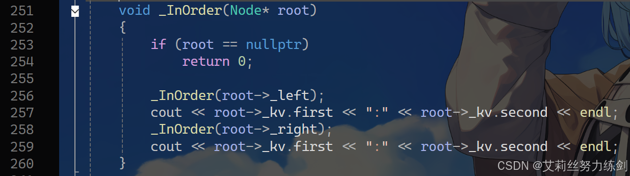 //cout << root->_kv.first << ":" << root->_kv.second << endl;