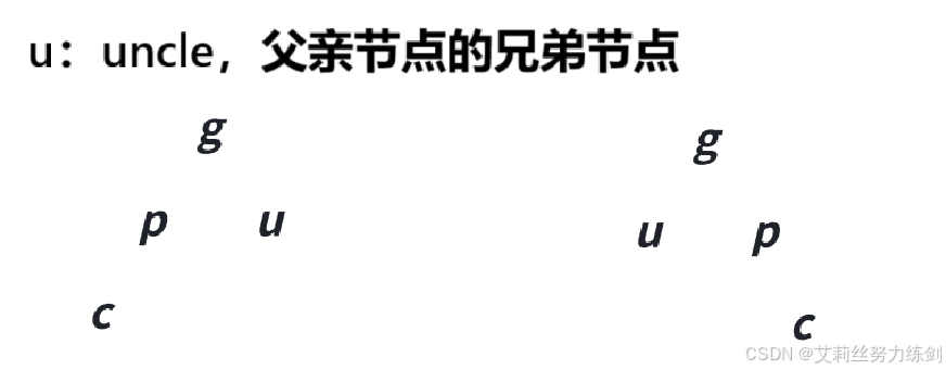 说明:下图中假设我们把新增结点标识为c(cur),c的父亲标识为p(parent),p的父亲标识为g(grandfather),p的兄弟标识为u(uncle)。