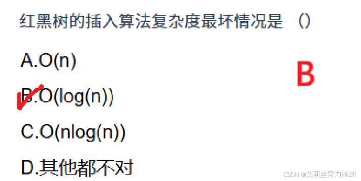 红黑树也是一棵二叉搜索树,其每个结点会增加一个存储位(颜色存储位),用来表示结点的颜色(两种颜色),可以是红色或者黑色(因此被称为红黑树)。通过对任何一条从根到叶子的路径上各个结点的颜色进行约束,红黑树确保没有一条路径会比其他路径长出2倍,因而是接近平衡的,也就是说,红黑树是近似平衡的,这里提前说一句,因为红黑树是近似平衡的,所以红黑树的插入的时间复杂度不存在最坏情况,就是O(logn),那么下面这道题就可以直接给出答案了——
