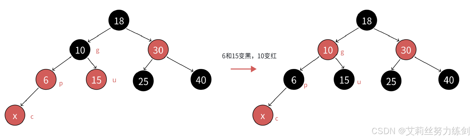 c为红,p为红,g为黑,u存在且为红,则将p和u变黑,g变红。在把g当做新的c,继续往上更新。