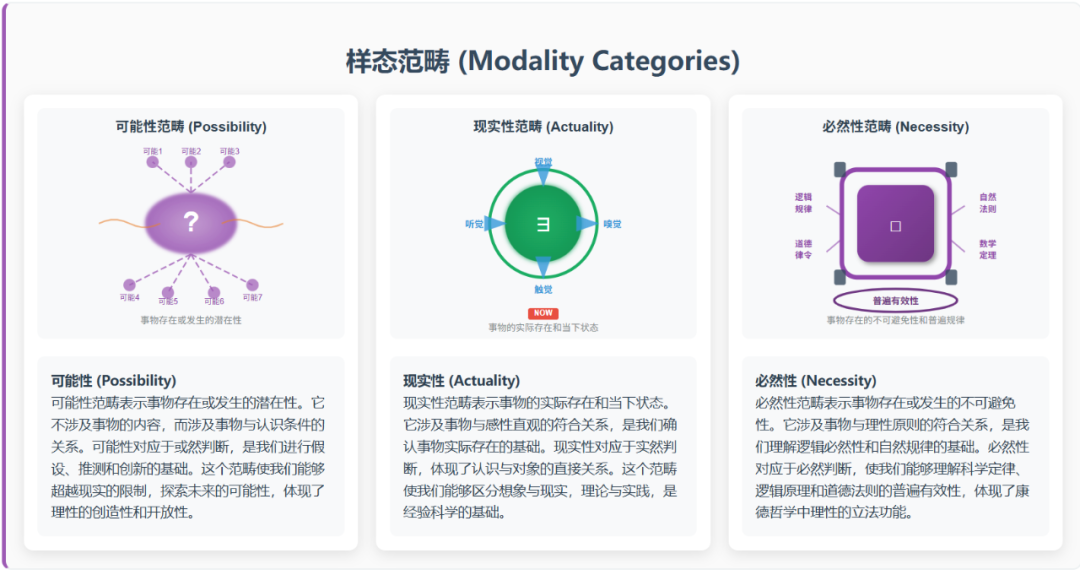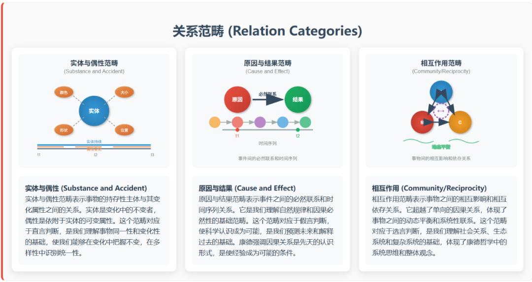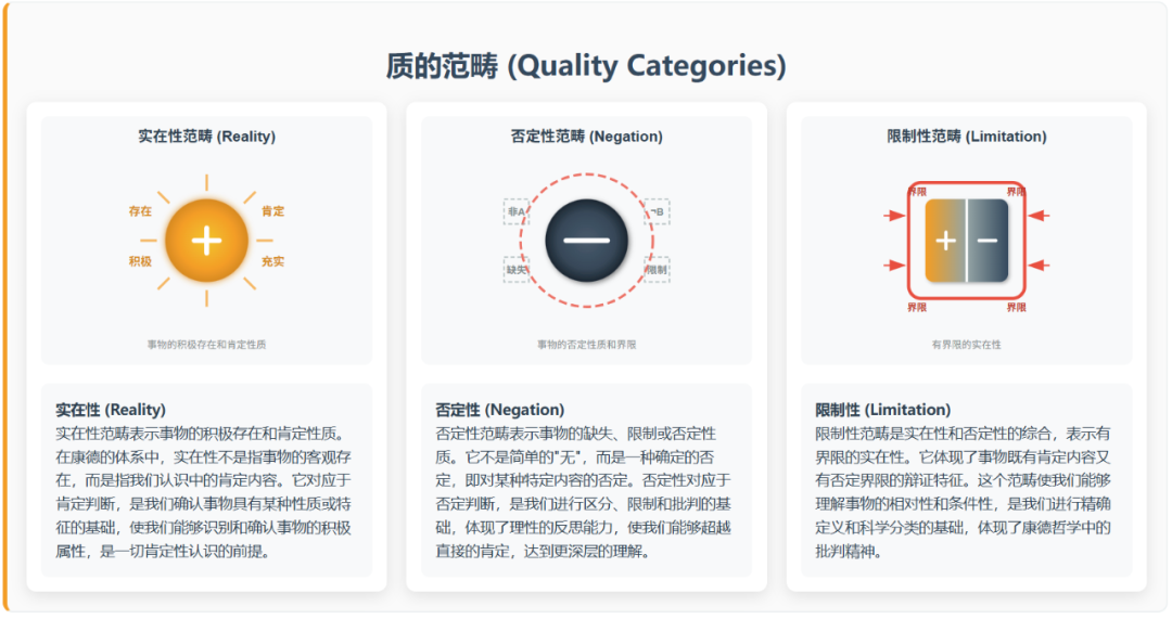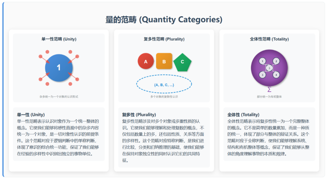 这就涉及到先验知性,简单来说就是康德提出的十二范畴,包括了质的范畴,量的范畴,关系的范畴,模态的范畴。康德将范畴定义为纯粹知性概念,它们是人类思维的基本结构,不依赖于经验而存在。范畴的主要功能是将感性直观的杂多材料统一为有序的认识对象。没有范畴,我们就无法形成关于对象的概念和判断。