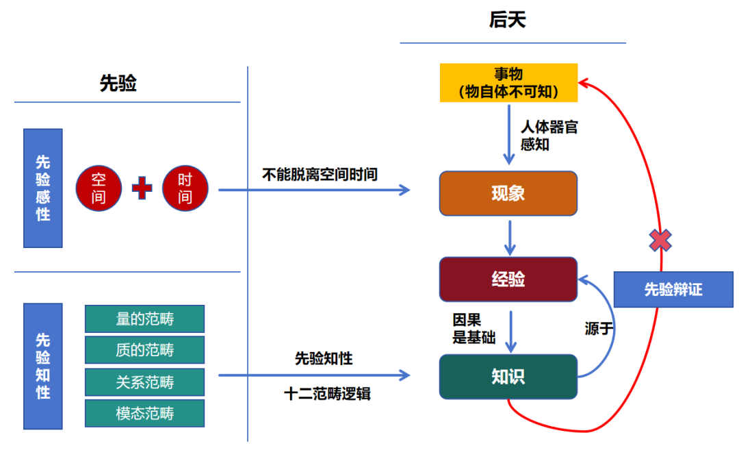从上图也可以更加清楚的看到知识的形成和转化过程,后天的知识和先验的感性知性之间的关系问题。也就是说先验的感性是形成经验,而先验的知性是形成知识,同时由于经验本身来源于知识,知识来源于感知后的现象,因此知识不能脱离经验而独立存在,这样知识就没有了支撑的前提,这也是为何后面又增加了先验辩证对其进一步约束的原因。