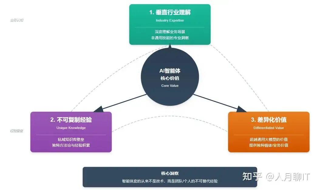 所以说,大家一定要清楚:AI智能体这么一个产品真正能够跑出来的,一定不是说你有智能体开发平台、你懂一个智能体怎么样去编排、怎么样去设计,而是你真正懂了一个垂直行业垂直业务的业务场景。智能体从来都不是卖的纯技术产品,而是卖的你团队或者是个人的经验。大家可以思考一下:你有没有这种值钱的经验?有的话,你的智能体可能能够跑出来;没有的话,那你的智能体一定是一个半成品,一定是不可能把它批量销售。