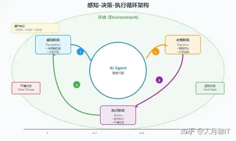 感知-决策-执行循环是AI Agent的核心工作模式,体现了智能系统与环境交互的基本范式。该循环始于感知阶段,Agent通过各种传感器收集环境信息,包括视觉、听觉、触觉等多模态数据,并进行预处理和特征提取,形成对当前环境状态的准确认知。这一阶段的质量直接影响后续决策的准确性。