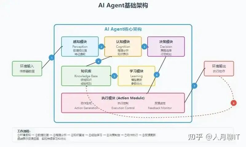AI Agent基础架构是所有智能代理系统的核心框架,它定义了Agent如何与环境交互并实现智能行为。该架构采用模块化设计,包含六个核心组件:感知模块负责接收和预处理环境信息,将原始传感器数据转换为可理解的特征表示;认知模块执行高层推理和分析,整合多源信息形成对环境的理解;决策模块基于当前状态和目标制定最优行动策略。