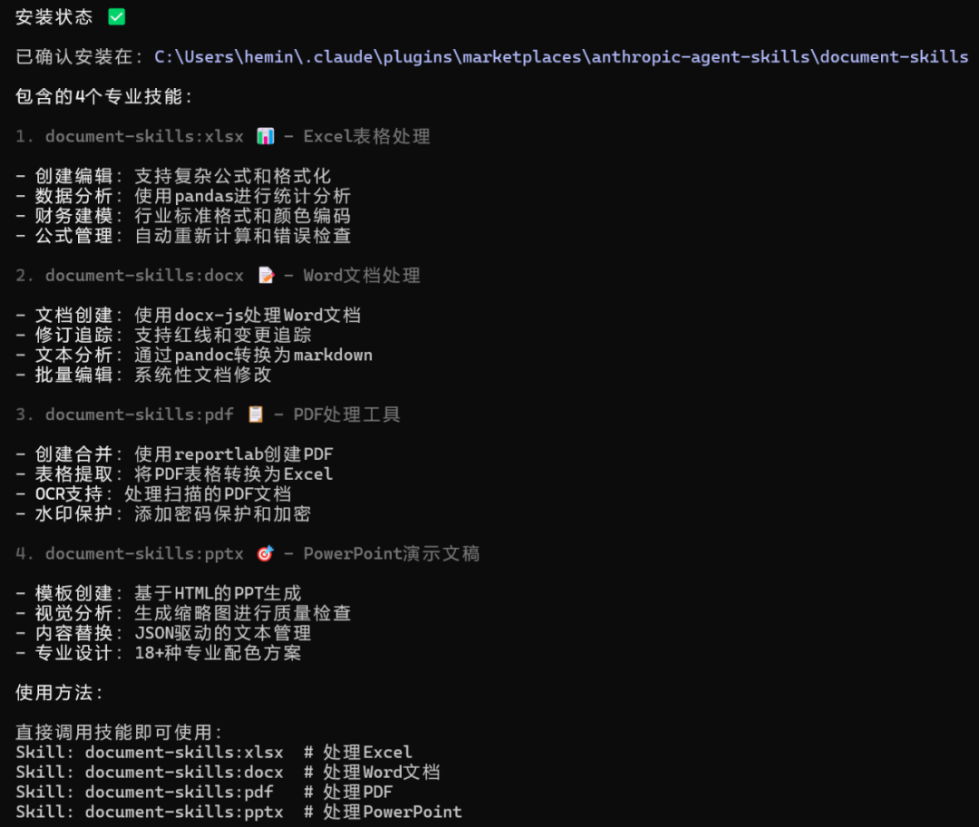 /plugin install document-skills@anthropic-agent-skills安装完成后,我们让AI自己输出该Skills的功能如下: