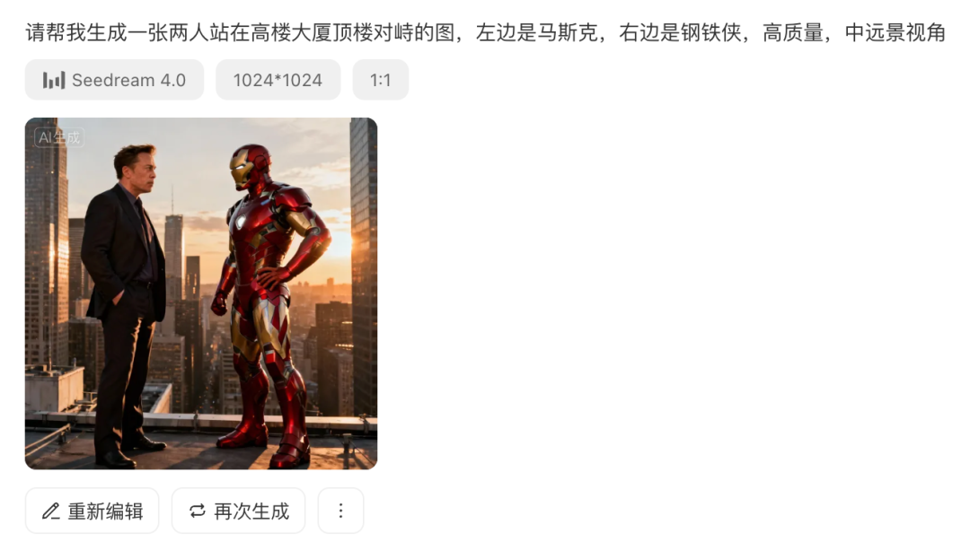 请帮我生成一张两人站在高楼大厦顶楼对峙的图,左边是马斯克,右边是钢铁侠,高质量,中远景视角