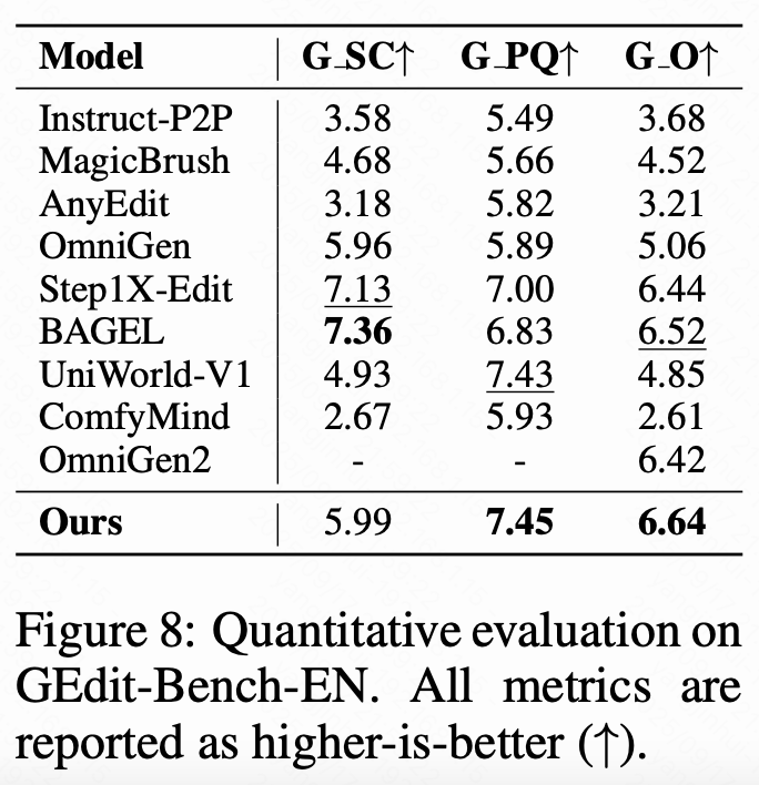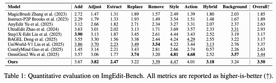 为确保权威的评估,在两个广泛采用的数据集上对本文的方法进行基准测试:GEdit-Bench(606 个样本)和 ImgEdit(811 个样本),这两个数据集以复杂的编辑指令和高质量的图像而闻名。按照标准协议,本文采用由 GPT-4o 执行的 VIEScore 作为本文的主要指标。为确保公平性和可重复性,本文将随机种子固定为 0,并对所有评估进行单次推理。在 GEdit-Bench 上使用单个 H20 GPU 时,本文的 Builder 需要 3.5 秒,最慢的工具需要 2.7 秒,总的管道延迟约为 7.2 秒,而在相同设置下,端到端方法 Bagel 的延迟超过 25 秒。