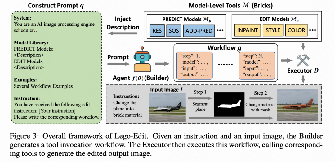 Lego-Edit,这是一种基于agent的新框架,用于生成式指令驱动的图像编辑。它使用经过RL微调的MLLM(Builder)来协调模型级别的编辑工具(Bricks),并通过两个关键创新实现:细粒度工具允许灵活组合和精确控制,以及三阶段渐进式RL训练策略,通过对开放域指令的无GT反馈来增强推理和工具组织能力。大量实验表明,Lego-Edit在GEdit-Bench和ImgBench上表现出色,展示了在处理灵活请求和整合新工具而无需重新训练方面的卓越准确性和泛化能力。未来的工作将扩展工具集以实现更广泛的功能,并探索基于agent的反馈以提高鲁棒性。