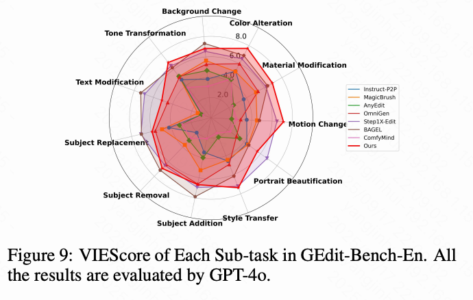 编辑工具: 采用 ICEdit 的框架(使用 FLUX-1 主干和 LoRA 微调,rank=32),但为各个任务实现了五个专用适配器,而不是多任务适配器。每个适配器在 OmniEdit 和 MagicBrush 精选的 10K 任务特定样本上进行训练,通过 VIEScore 评估,使用全局批量大小为 8,在 768×768 分辨率下进行 10K 步训练。
