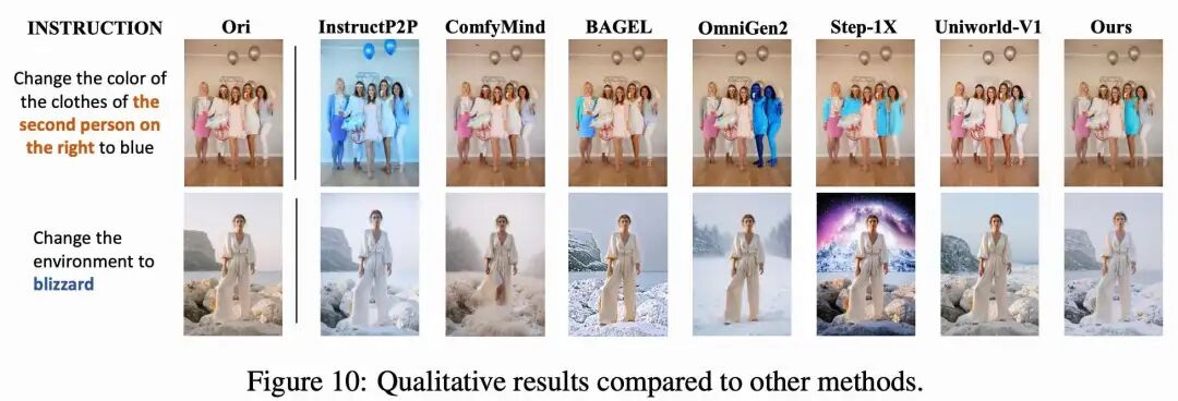 首先展示模型的零样本能力,随后通过大量实验验证了本文框架在图像编辑基准测试中的优越性。接着,分析模型级工具带来的性能提升和其他优势,最后展示通过强化学习提升的 Builder 的泛化能力和性能。