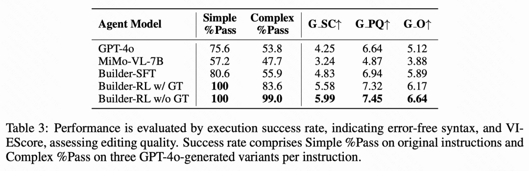 强化学习训练的有效性。 下表 3 中 GEdit-Bench 的消融实验显示了本文渐进式强化学习训练的有效性。从 Builder-SFT 开始,其在简单和复杂成功率以及 VIEScores 上都优于基准模型 MiMo-VL-7B 和强大的 MLLM GPT-4o。随后使用真实数据的强化学习训练(Builder-RL w/ GT)在简单任务中实现了 100% 的成功率,在复杂任务中实现了 83.6% 的成功率,并且 VIEScores 更高。最终的无 GT 强化学习训练(Builder-RL w/o GT)保持了 100% 的简单任务成功率,将复杂任务成功率提升至 99.0%,并达到了最高的 VIEScores。尽管简单任务的准确率相同,这种复杂任务的改进表明参数输出更为准确,并增强了工具接口的组合理解能力,使得在灵活指令下的执行更加可靠。