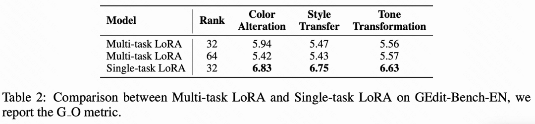 任务专用工具的必要性。为了验证 Lego-Edit 的设计,本文将其任务专用架构与使用相同设置的统一替代方案进行比较。三个独立的 LoRA 适配器在每个任务上训练了 10K 样本,而统一模型使用了一个合并的 30K 数据集。如下表 2 所示,专用模型的表现优于统一模型(例如,在颜色改变中为 6.83 对比 5.94)。在统一模型中增加 LoRA 等级没有带来收益。定性结果显示在统一设置中频繁出现任务混淆,这突显了专用化对编辑保真度的重要性。