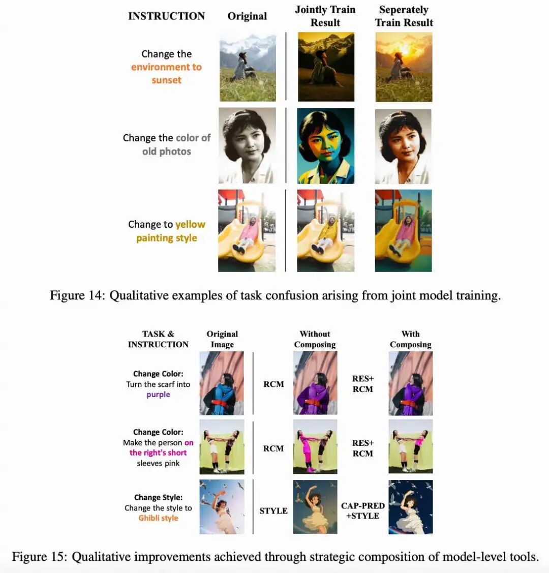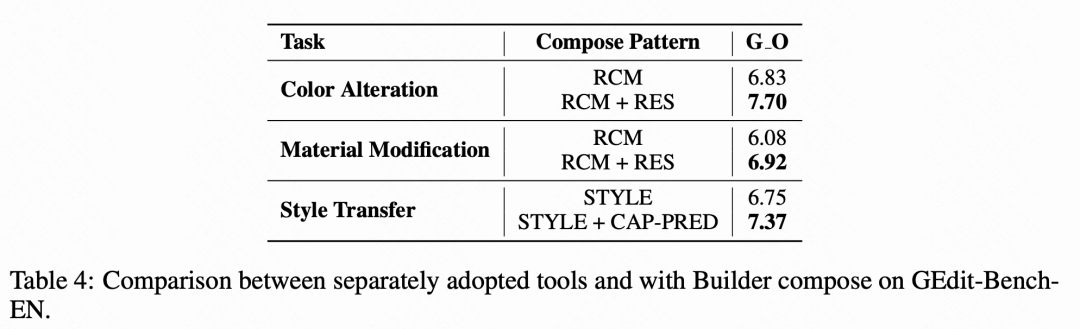 工具组合的有效性。 为了评估在 Lego-Edit 中显式工具组合的影响,本文检查了其在 GEdit-Bench 子任务中的表现。如下表 4 所示,将 RES 分割掩码与 RCM 集成提高了颜色改变和材料修改的 G O,突出显示了 RES 空间控制的优势。同样,将 CAP-PRED 文本描述纳入 STYLE 提升了风格迁移中的 G O,因为文本提示加强了风格化输出与源图像之间的语义对齐。这些结果表明,工具组合提高了性能,证实了 Lego-Edit 协调专用工具以实现卓越编辑性能的能力。