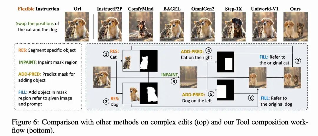 具有灵活工具组合的零样本复杂编辑:下图 6 展示了在灵活指令下编辑结果的视觉对比,以及 Builder 的工具组合过程。对于“交换”指令,尽管 Builder 并未在此任务上进行显式训练,但它通过首先使用 RES 和 INPAINT 移除对象 A,然后通过 ADD-PRED 和 FILL 插入对象 B,有效地将指令分解为原子操作。这个例子展示了它为灵活编辑指令组合专用工具的能力,使其能够进行超越端到端或精心设计的管道模型的复杂编辑。