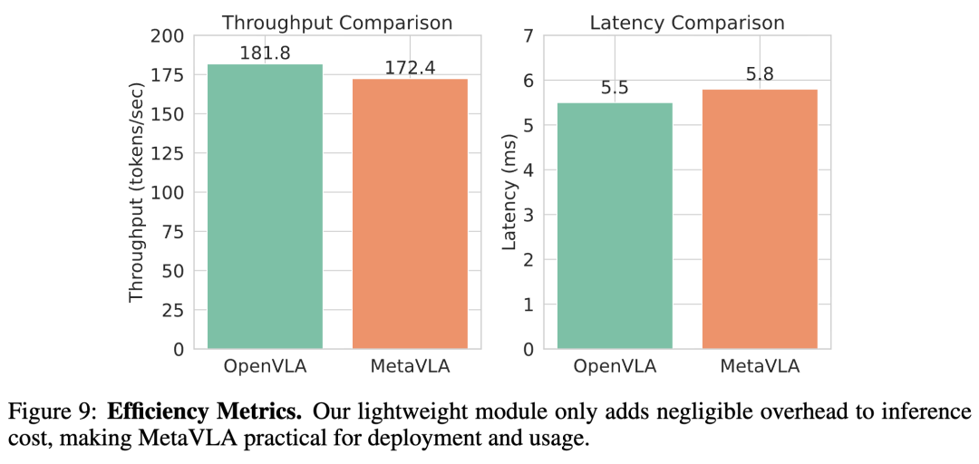 这些发现突出了 MAR 在可扩展、基于记忆的元学习框架中的有效性。然而,与完整的 MetaVLA(表1)相比,MetaVLA-EACH 牺牲了统一泛化性和训练效率,需要四个模型和更多计算量(120K 对比 75K 步)。