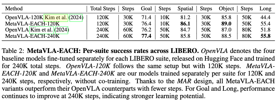 下表2中的结果揭示了三个关键发现:(1) MetaVLA-EACH 在最终训练步骤上优于 Hugging Face OpenVLA 基线(OpenVLA Team,2024);(2) 它在所有套件中更早达到更高的成功率;(3) 在复杂套件(Goal,Long)上性能持续提升,而在较简单的套件(Spatial,Object)上更早收敛——表明任务多样性对更具挑战性的任务更有益。