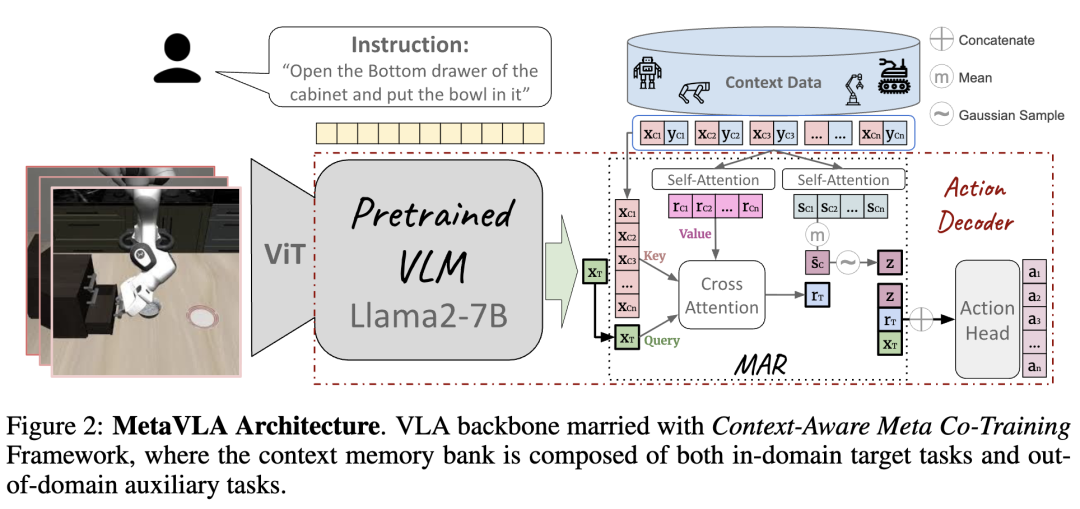 不同于使用小规模神经网络的标准 ANP,集成了来自 OpenVLA 的预训练 Llama2 主干。MAR 同时生成随机与确定性的上下文潜在向量,并在最终输出层之前与 Llama 的隐藏状态进行拼接。组合后的表征随后通过语言模型头(LM head)产生输出 logits,从而可通过标准的 Llama 解码实现端到端训练。框架概览见下图2。