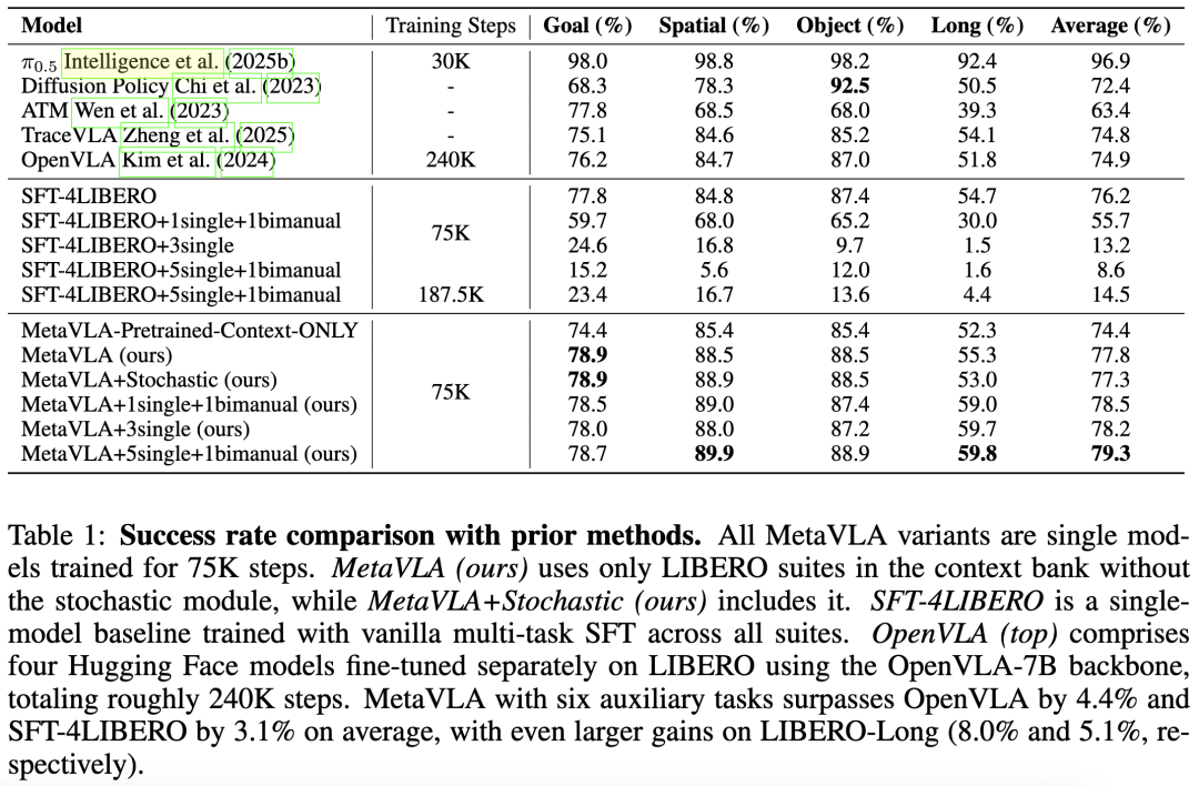 如下表 1 所示,MetaVLA(无论是否包含辅助任务)在所有 LIBERO 任务及平均性能上均优于所有基线模型,包括 OpenVLA 基线与 SFT-4LIBERO。引入六个辅助任务时,其性能相比 OpenVLA 提升 4.4%,相比 SFT-4LIBERO 提升 3.1%,尤其在 LIBERO-Long 上分别提升 8.0% 与 5.1%。此外,MetaVLA 将模型数量减少至 1 个,并将训练步数从 240K 降至 75K。
