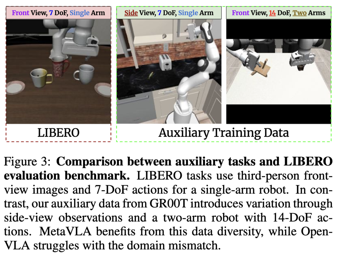 LIBERO 任务使用带有抓手的 Franka Emika Panda 机械臂,并主要采用正面摄像机视角。相比之下,选定的 GR00T 任务包括使用正面视角的双臂操作以及仅使用侧视角的单臂操作。这些差异被有意引入,以测试 MetaVLA 的鲁棒性与泛化能力。三类任务差异的示例见下图3。