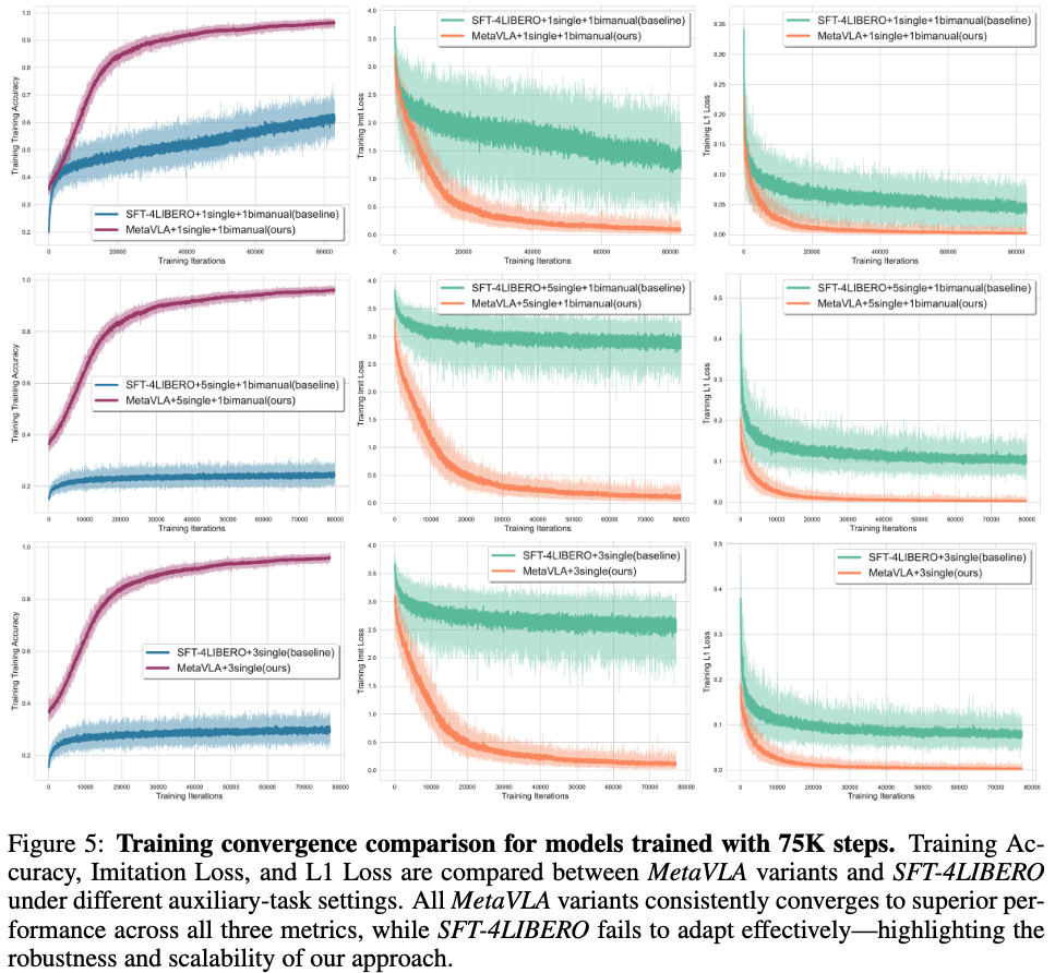 如下表1所示,在基础多任务 SFT(SFT-4LIBERO+辅助任务)中增加辅助任务会持续降低性能。随着任务数量的增加,退化现象愈发严重,表明模型难以处理领域偏移且无法收敛。一个可能的因素是每个任务的训练步数减少。例如,在 SFT-4LIBERO+5single+1bimanual(训练 75K 步)中,每个任务的步数从 SFT-4LIBERO 的 18.75K 降至 7.5K。为验证这一点,将训练步数增加至 187.5K。虽然性能略有提升,但仍显著低于 MetaVLA(无论是否包含辅助任务)。此外,如下图 6 所示,在 187.5K 步时,三项指标——Accuracy、Imitation Loss 与 L1 Loss——的训练曲线均显示其适应性不足。这支持了我们的观点:MetaVLA 具备更高的可扩展性,能在不出现优化不稳定的情况下有效利用辅助数据。由于计算限制,对该观点的更严格证明留待未来工作。