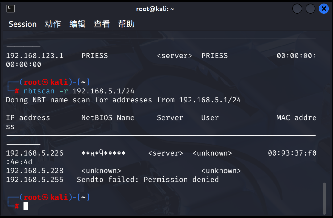 NBTSCAN 是用于扫描 NetBios 名称信息的IP网络的程序。 它将 NetBios 状态查询发送到提供的范围和列表中的每个地址收到人类可读形式的信息。每个响应的主机列表IP地址,NetBios 计算机名称,登录用户名和 MAC 地址