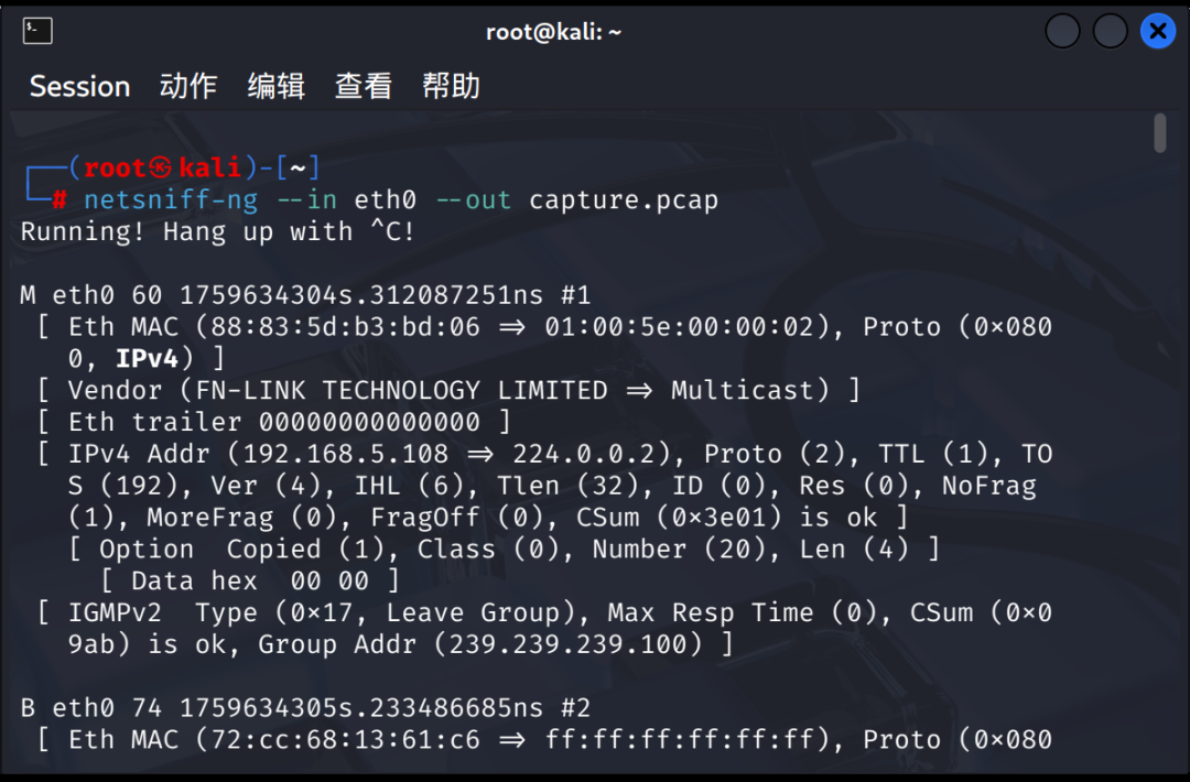 arpspoof是一款ARP欺骗工具。它允许攻击者伪造网络设备的MAC地址,以欺骗其他设备,并截获其通信。