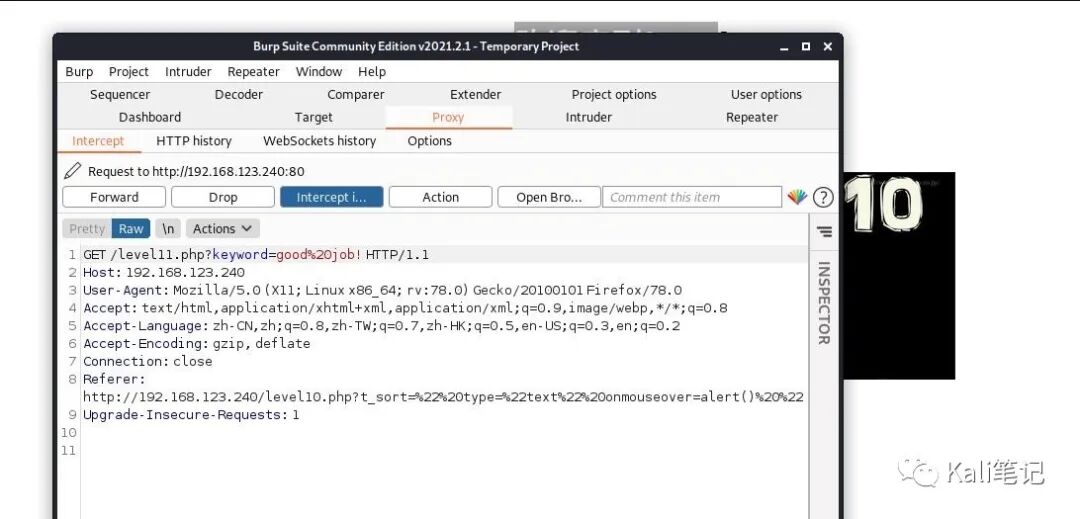 其中多了一个input,它的value很有趣,就是第10关的url。在第十关完成的瞬间,我们使用burp抓取数据包