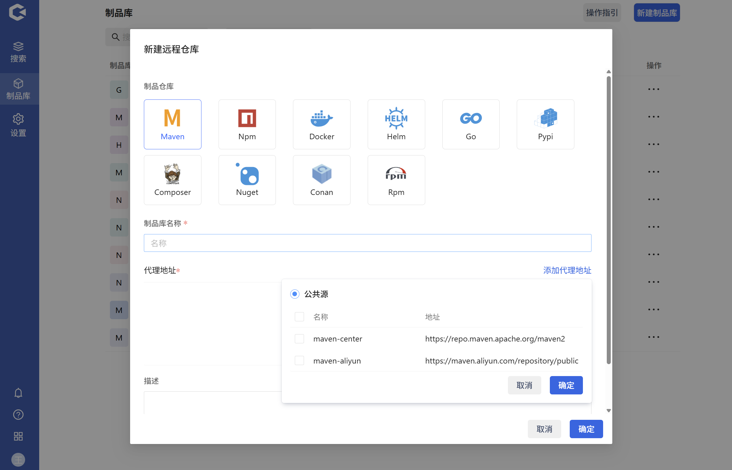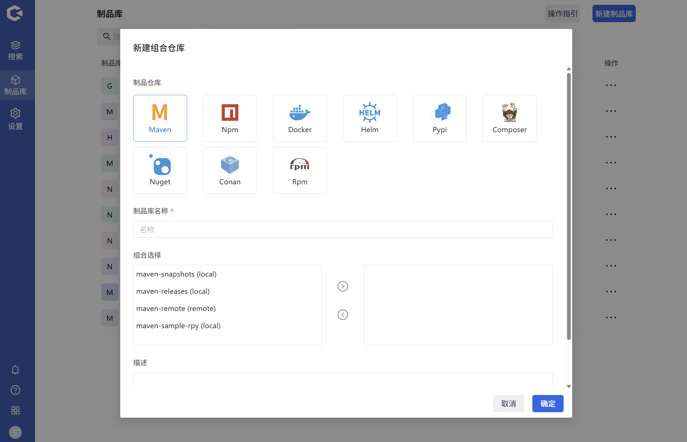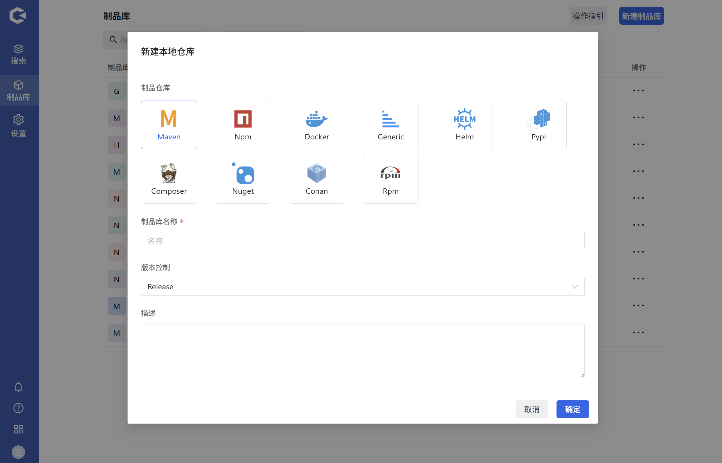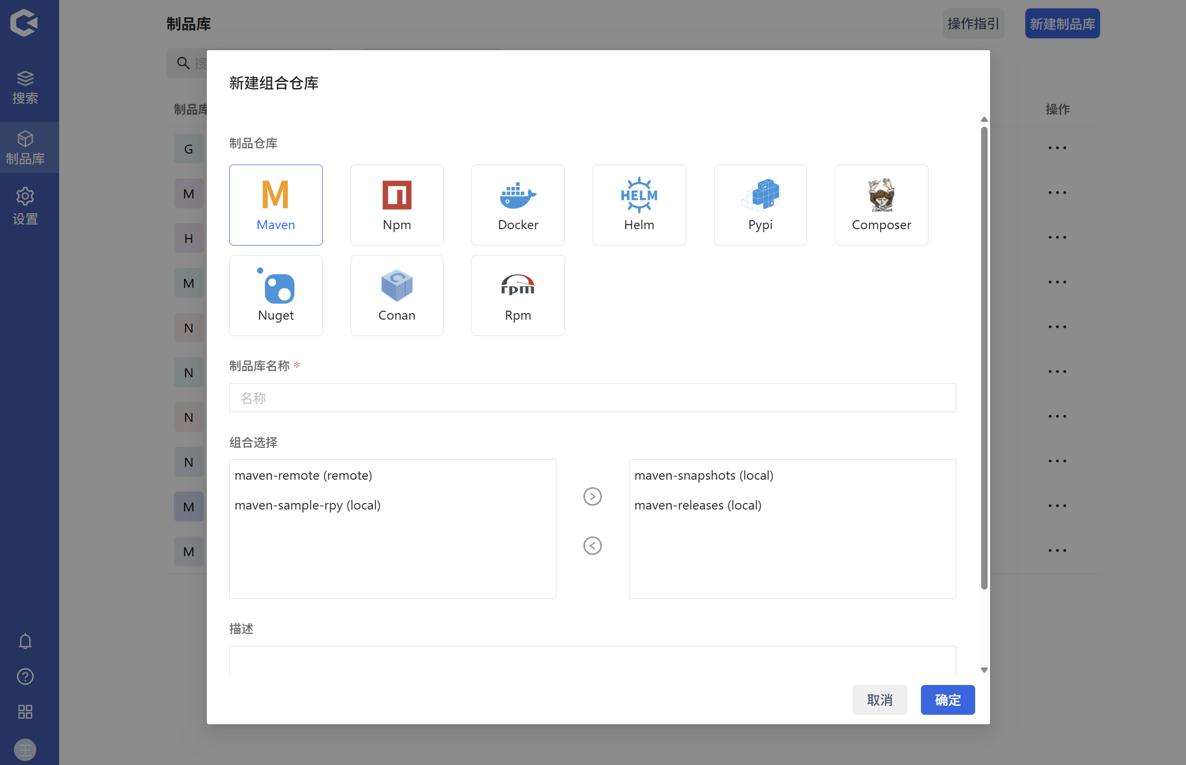 制品仓库 | 是 | 制品库类型,默认为Maven |