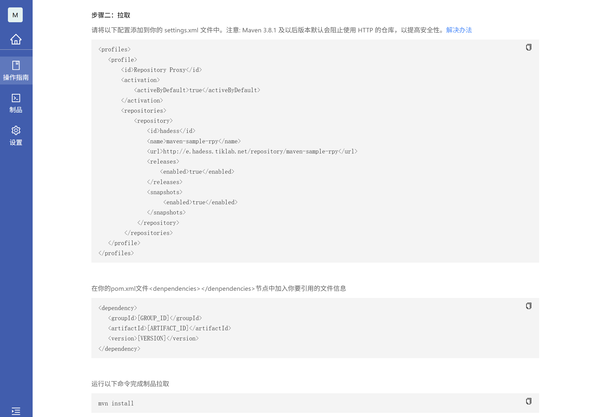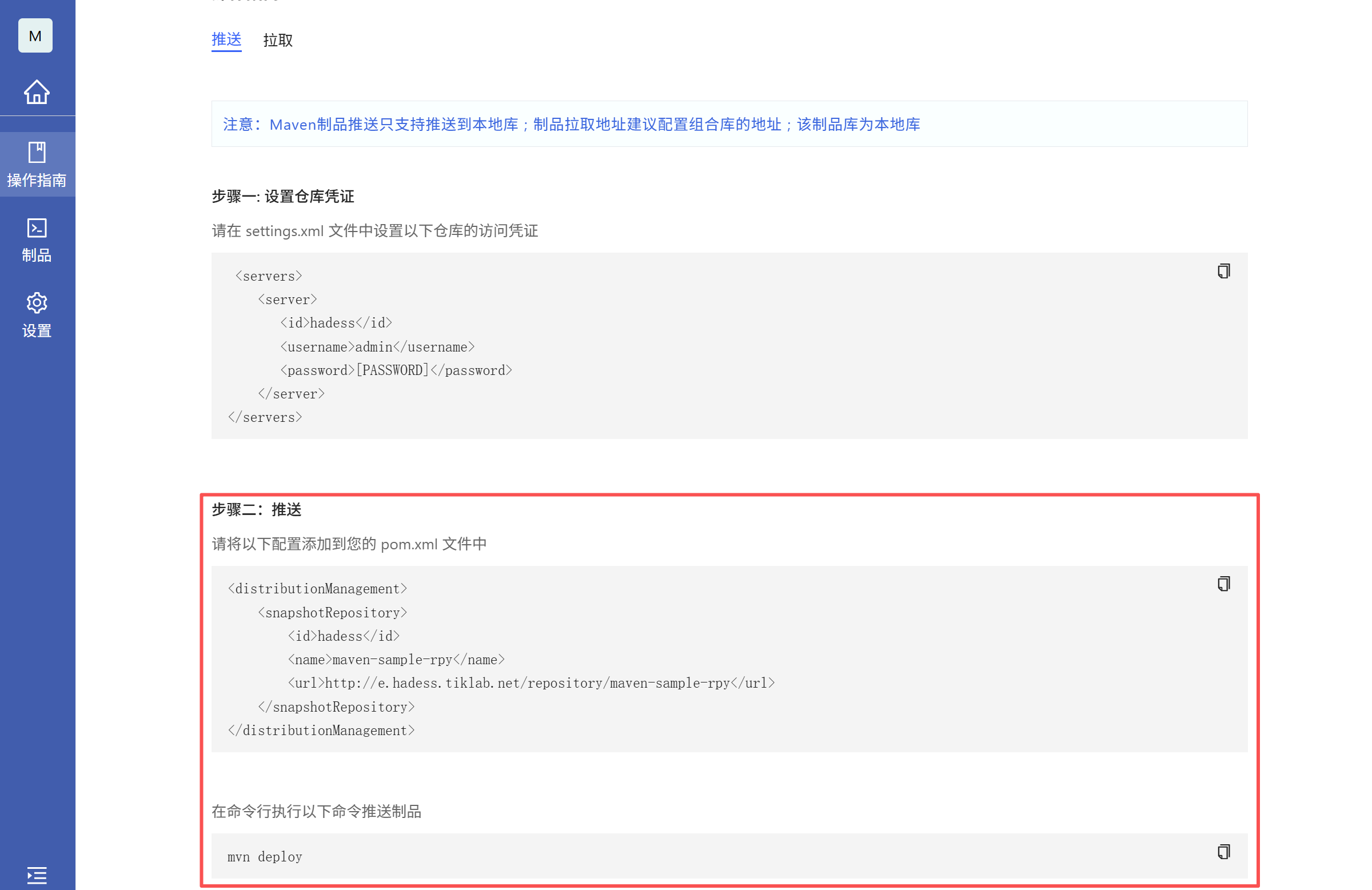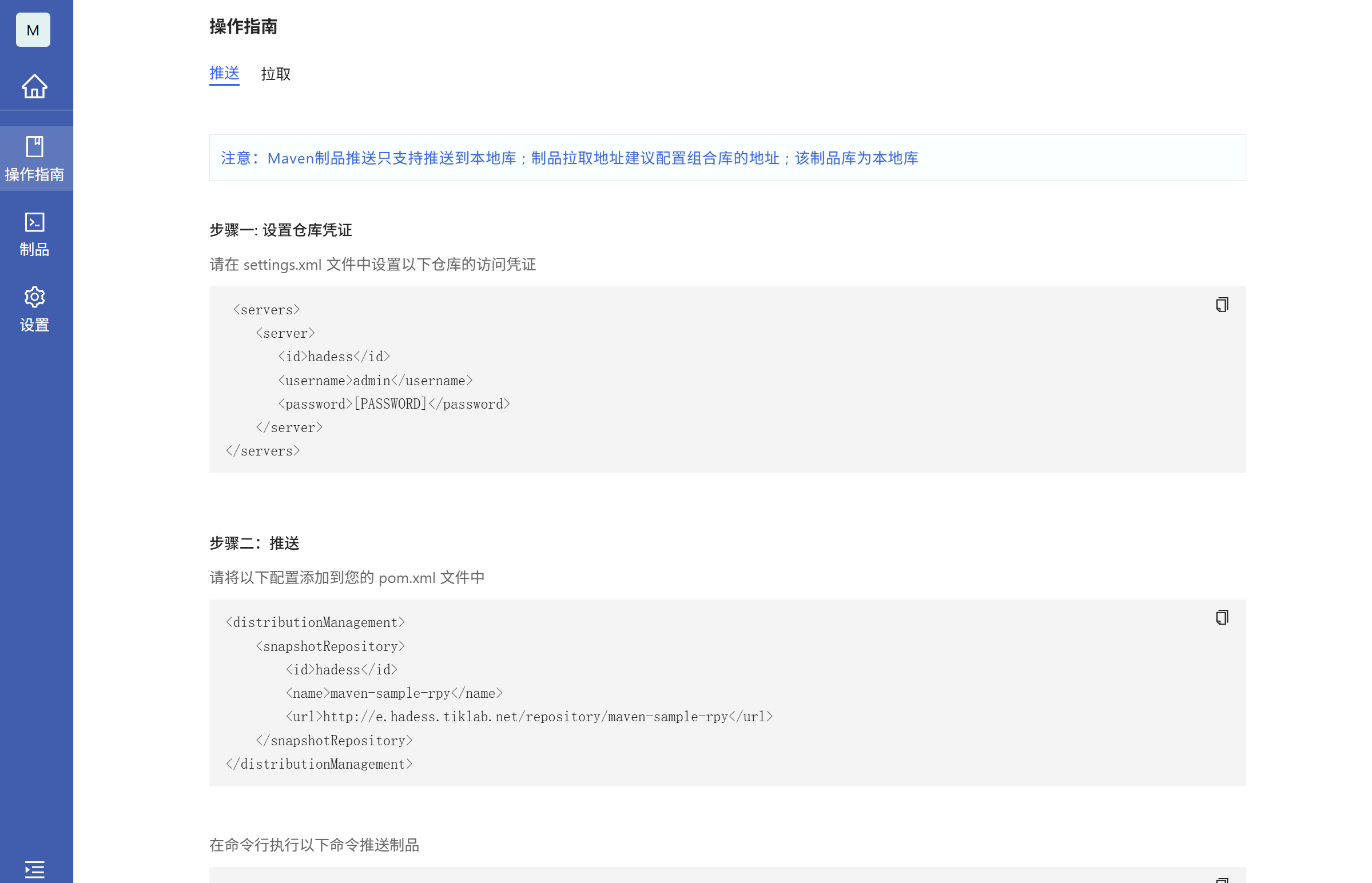 2. 进入制品库界面点击右上角操作指引选择maven进入操作指引界面,替换对应的文本。将其添加至 settings.xml 文件中。