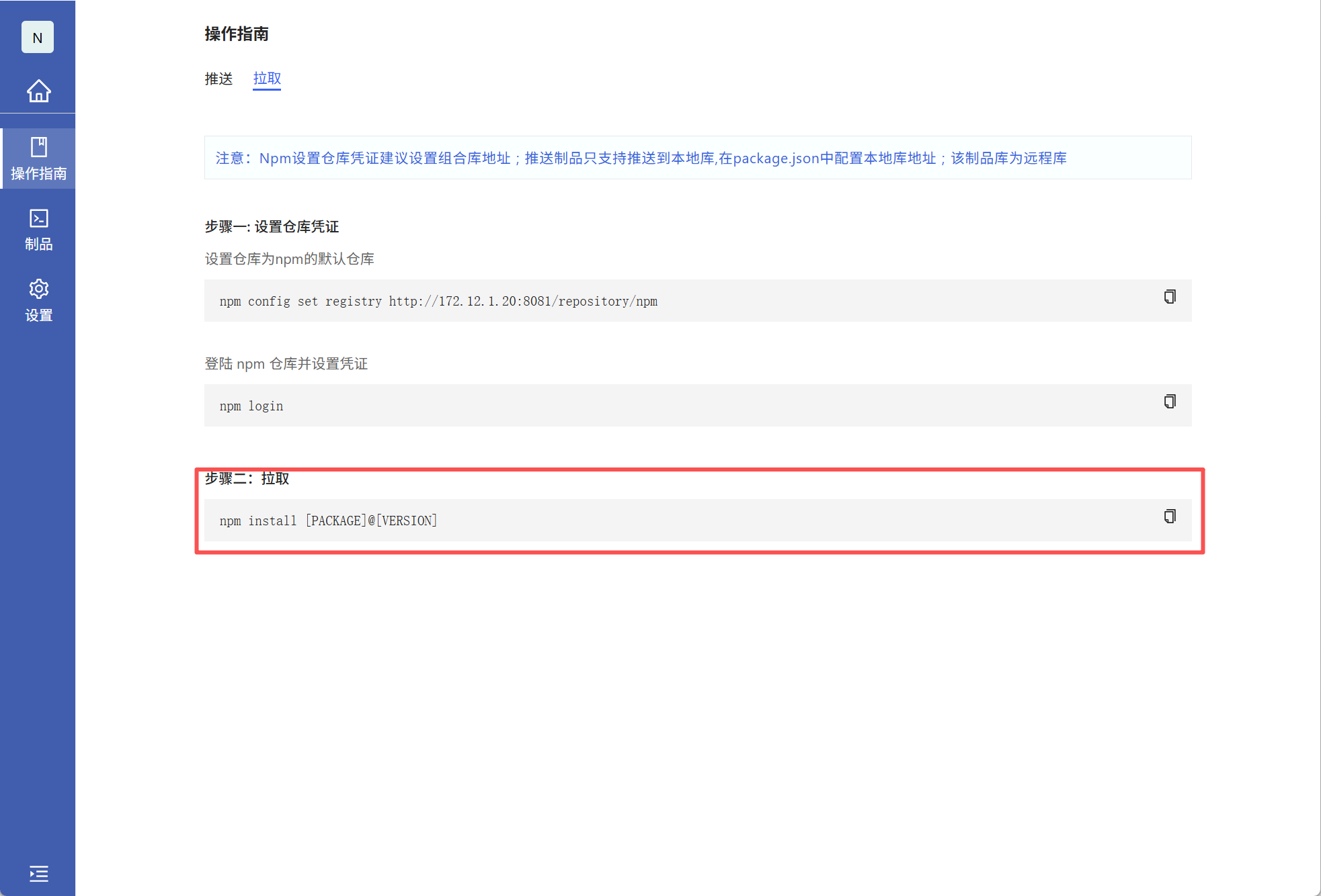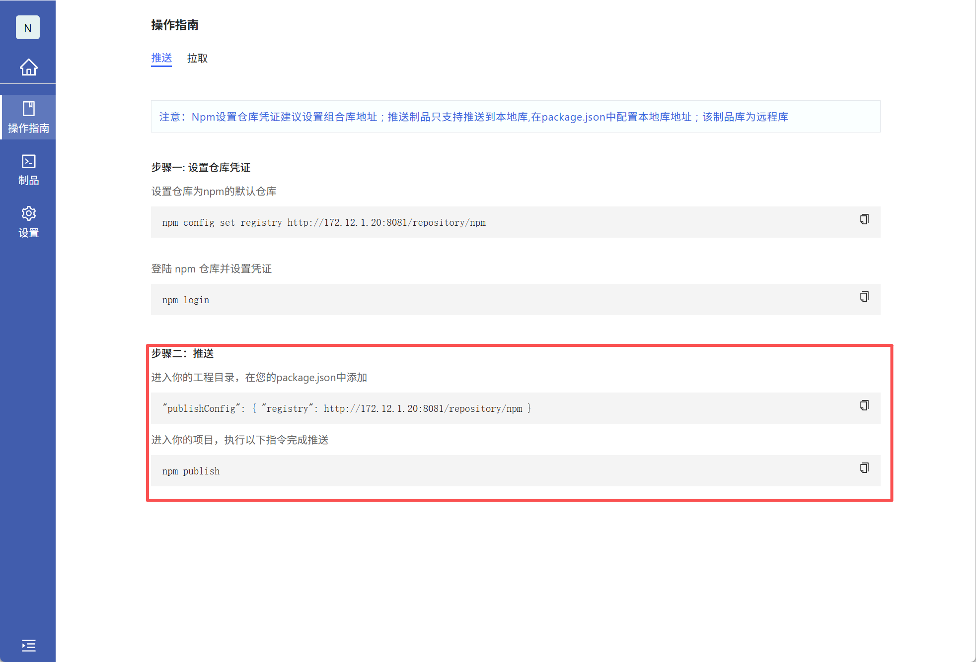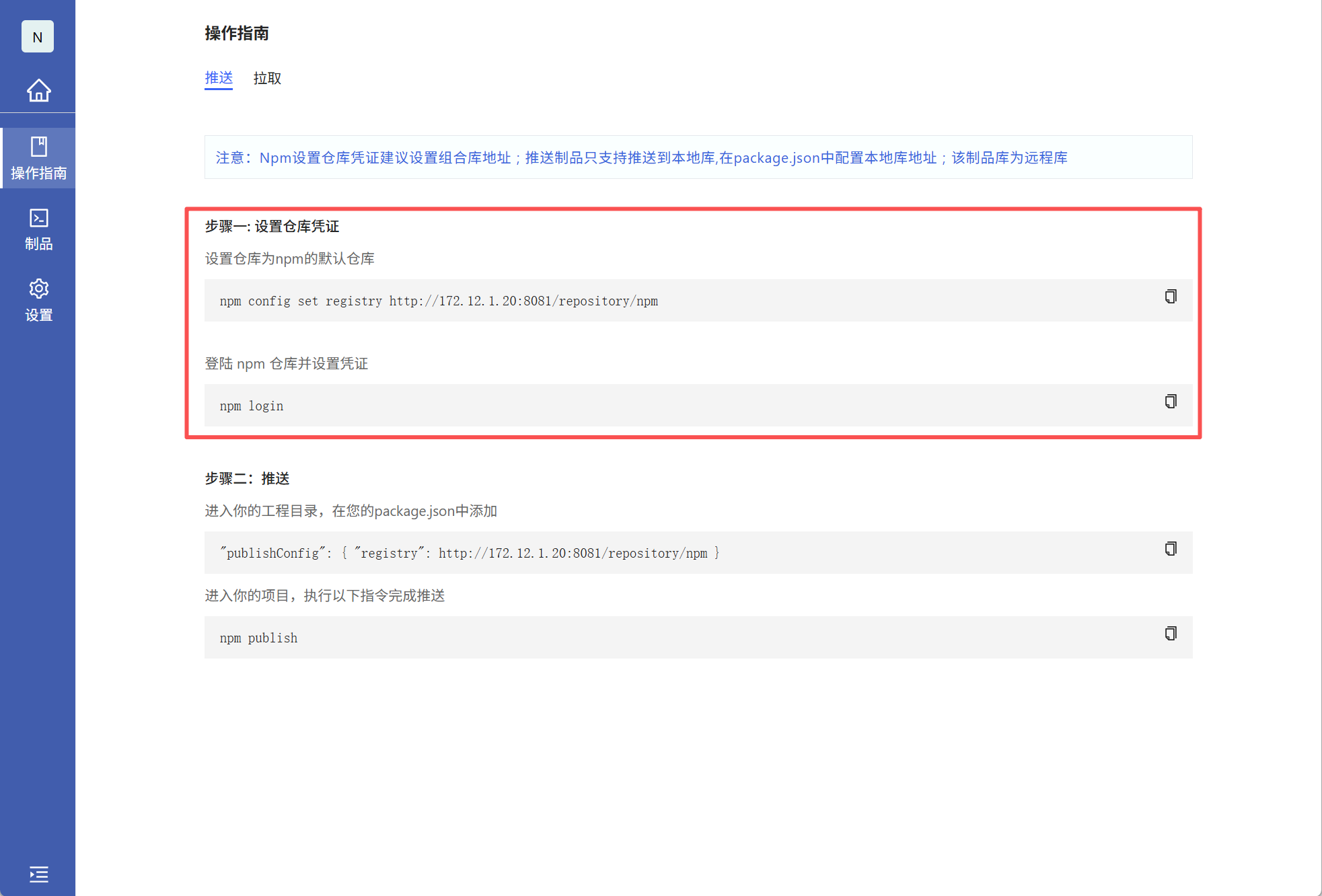 配置凭证:在npm操作指引界面 替换文件,在提交的项目中执行下面命令