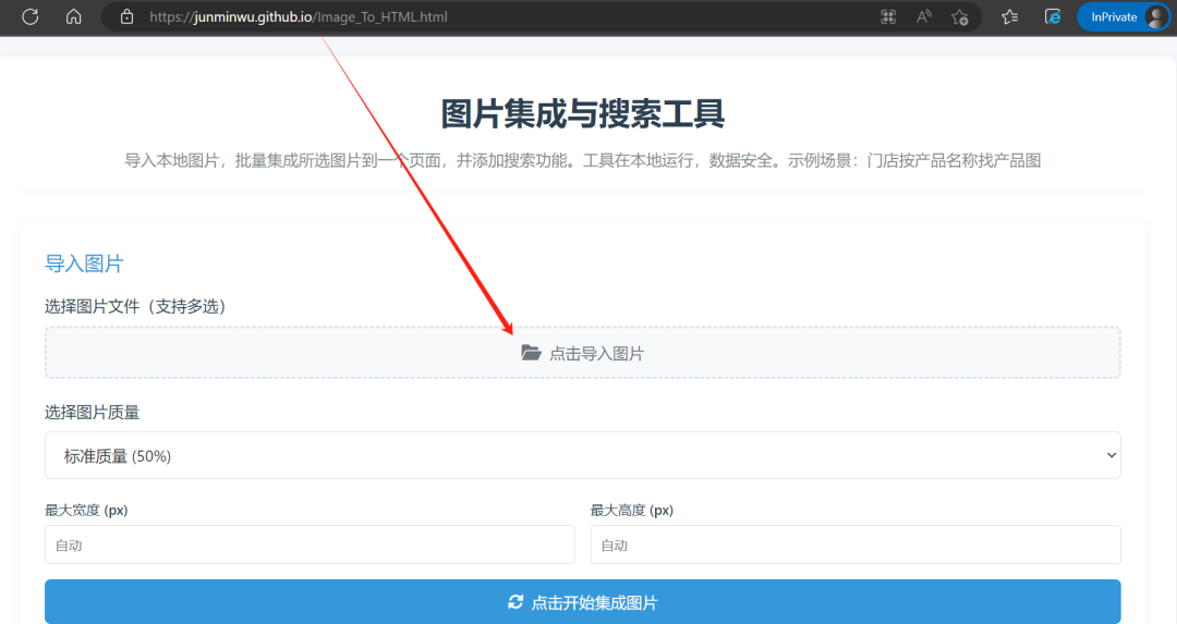 如图导入本地文件夹中的图片,选择需要展示的图片质量和大小。图片质量越高、宽度高度越大,集成后的文件越大。