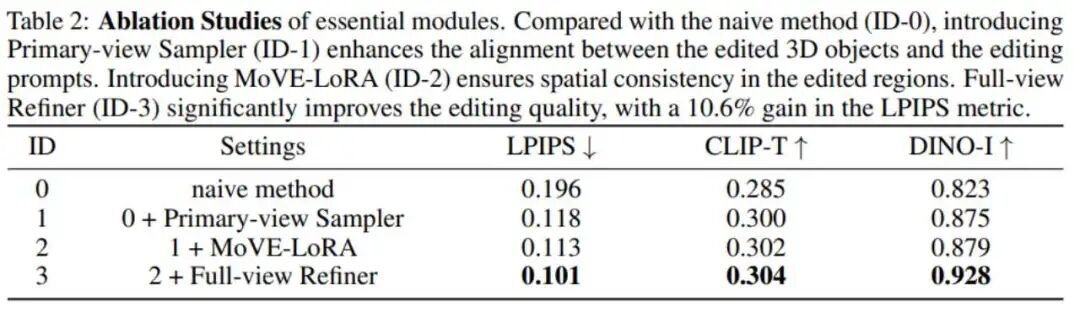 - 消融实验:论文充分验证了渐进式视图编辑范式和其中三个模块的有效性,移除这些模块,性能显著下降。