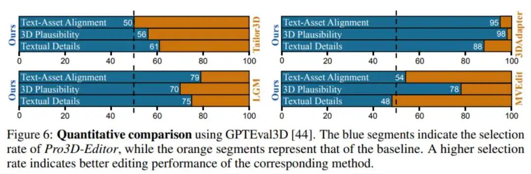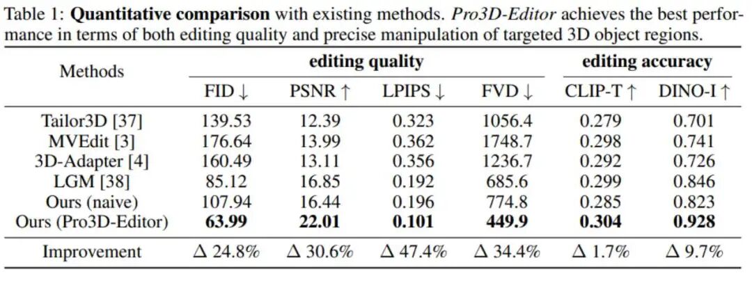 - 定量指标:在3D物体局部编辑任务上,相比与baselines的方法,Pro3D-Editor 在编辑质量(LPIPS)上提升 47.4%、在编辑准确性(DINO-I)上提升 9.7%。此外,Pro3D-Editor的编辑结果更大概率地被GPTEval3D认为是更优的。