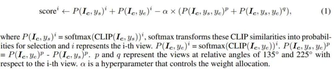 2.方法:计算编辑文本与所有视图间的相似度分数,其中需加入一项惩罚项。该惩罚项用于应对 I2MV 基模生成视图视角不均匀的问题。
